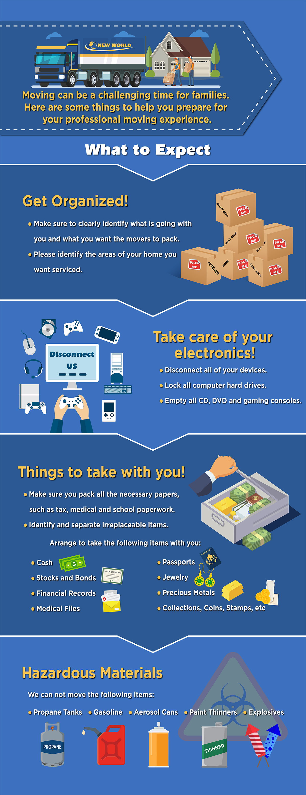 Arrange for safe transportation of all irreplaceable items before our crew arrives. New World CANNOT move and is not liable for cash, stocks and bonds, financial records, important papers, jewelry, precious metals, coin and stamp collections, etc.